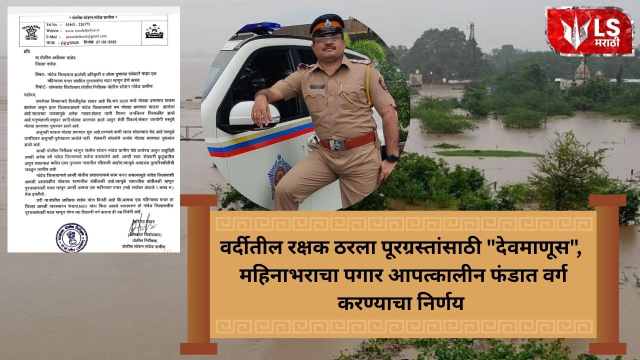 यातच नुकसानग्रस्त शेतकऱ्यांना मदत करण्याचे आवाहन होत असतानाच, नांदेड येथील ग्रामीण पोलीस ठाण्याचे पोलीस निरीक्षक ओमकांत चिंचोलकर यांनी त्यांचे एक महिन्याचे वेतन पुरग्रस्तांसाठी दिले आहे. माहे सप्टेंबर 2025 चे एक महिन्याचे एक लाख रुपये वेतन आपत्कालीन फंडात वर्ग करावे, अशी विनंती पोलीस निरीक्षक ओमकांत चिंचोलकर यांनी जिल्हा पोलीस अधीक्षक अबिनाश कुमार यांना पत्राद्वारे केली आहे. हे पत्र समाजमाध्यमांवर वायरल झाले असून चिंचोलकर यांच्यावर कौतुकाचा वर्षाव होत आहे.