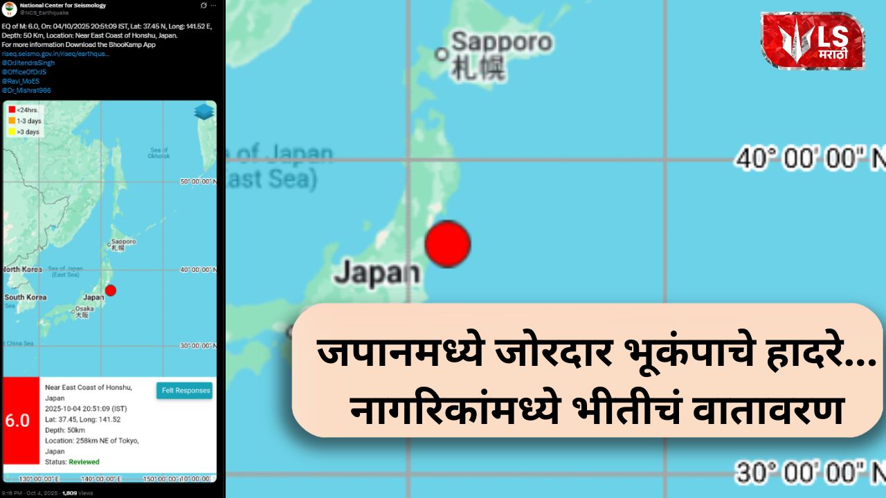 टोकियो : शनिवारी रात्री उशिरा जपानला एक शक्तिशाली भूकंपाचा धक्का बसला. भूकंपाची तीव्रता रिश्टर स्केलवर 6.0 इतकी होती. राष्ट्रीय भूकंपशास्त्र केंद्र (NCS) नुसार, भूकंपाचं केंद्र 50 किलोमीटर खोलीवर होते. सोशल मीडियावरील एका पोस्टमध्ये, NCS नं म्हटलं आहे की, “भूकंपाची तीव्रता: M 6.0, वेळ: 04/10/2025 रोजी 20:51:09 IST, अक्षांश: 37.45 उत्तर, रेखांश: 141.52 पूर्व, खोली: 50 किमी, स्थान: होन्शु, जपानच्या पूर्व किनाऱ्याजवळ.”