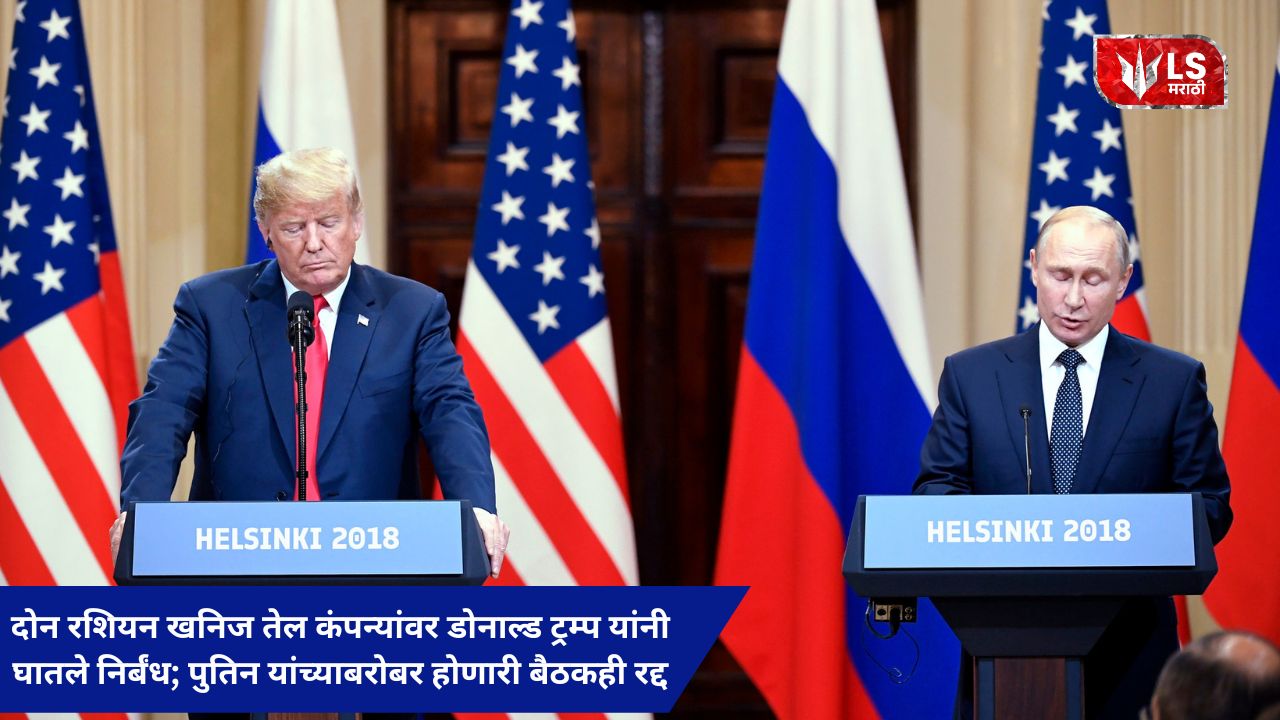 Trump sanctions Russian oil companies : अमेरिकेचे अध्यक्ष डोनाल्ड ट्रम्प यांनी रशिया-युक्रेनमधील संघर्ष मिटवण्याकरिता कठोर पाऊल उचललं आहे. रशियाच्या दोन सर्वात मोठ्या खनिज तेल कंपन्यांना लक्ष्य करुन त्यांनी नवीन निर्बंध लादले आहेत. त्याचबरोबर रशियाचे अध्यक्ष पुतिन यांच्याबरोबर होणारी बैठकदेखील रद्द केली आहे. व्हाईट हाऊसमध्ये नाटोचे सरचिटणीस मार्क रुट यांची भेट घेतल्यानंतर डोनाल्ड ट्रम्प यांनी युद्ध मिटेल, अशी आशा व्यक्त केली. त्यांच्या (रशियाच्या) दोन मोठ्या तेल कंपन्यांविरुद्ध खूप मोठे निर्बंध आहेत. आम्हाला आशा आहे की ते (रशिया आणि युक्रेन संघर्ष) जास्त काळ चालणार नाही. हे युद्ध मिटेल, अशी आम्हाला आशा आहे, असे ट्रम्प यांनी म्हटलं. रशियाचे अध्यक्ष व्लादिमीर पुतिन यांच्याशी चर्चा करताना मागील वेळी कोणतंही यश आलं नव्हतं.